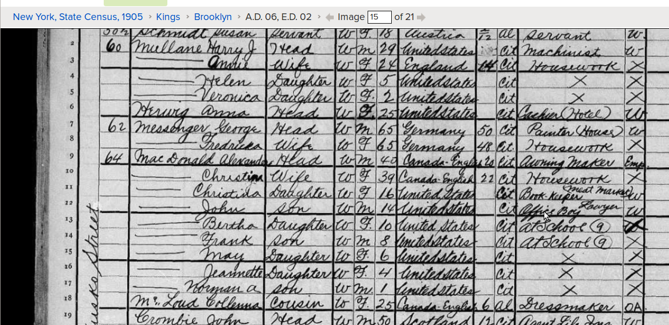 In 1905, the family was living in Brooklyn, New York. The household included: Alexander Macdonald 40; Christine Macdonald 39; Christina Macdonald 16, a book-keeper; John Macdonald 14, office boy for a lawyer; Bertha Macdonald 10, Frank Macdonald 8, May Macdonald 6, Jeannette Macdonald 4, Norman A Macdonald 1 and Collenna Mcloud 25, a cousin.