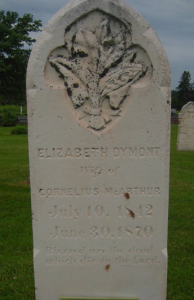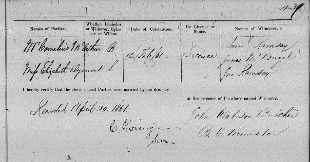 Elizabeth Dymant married Cornelius McArthur on February 12 1861. Witnesses at the marriage were James MacDougall (who was Sarah Dyment's first husband) and John and Sam Ramsay. The marriage bond, dated 7 February 1861, was taken out by Cornelius McArthur, Lot 7, and Humphrey Dymant, Lot 13. Cornelius was known to the Dyment family - he had been one of the witnesses at Humphrey Dyment Jr.'s marriage to Nancy McDougall in 1860.