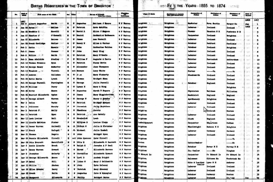 On US census forms, Cornelius said he had emigrated to the States in 1865 or 1867, and Cornelius and Elizabeth sold some of their land in Lot 7 in 1866. As a result of a suit undertaken by James Yeo against Cornelius McArthur, Richard Hunt, the sheriff, seized 50 acres of property in Lot 7 in July 1867. The newspaper notice said that Cornelius' wife Elizabeth was living there, possibly while Cornelius was in Massachusetts. There is also a document that places the couple in in Brighton, Massachusetts around this time: Cornelius and Elizabeth Dyment from PEI registered the birth of a son, "Josephius McCartey", born in PEI on April 9 1867, the date of birth of their son Alvah. Both Cornelius and his brother Mathias were in a Massachusetts city directory in 1869 and 1870, in Cambridge.