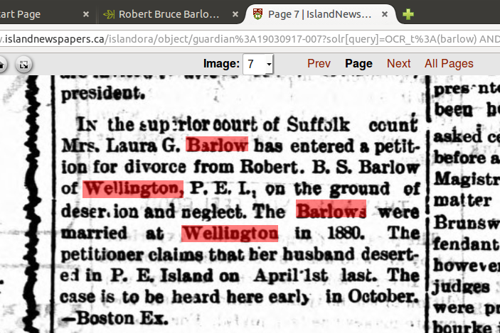 m. 16th March, Robert Bruce BARLOW / Laura Ellen BLAKENY adopted d/o of R. KILPATRICK and d/o late Isaac BLAKENY of Salisbury (West Co.) POST 22 April - at Wellington, Lot 16, P.E.I.