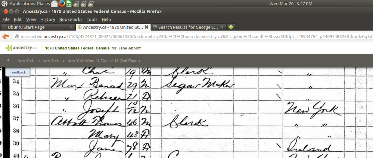 Elizabeth Abbott McArthur's obituary indicated that only one sister was surviving at the time of her death in 1905. I was unable to find Thomas in census records after 1880, so I have assumed that he died before his sister. Although there were two or three men named Thomas Abbott in New York around this time, it seems very likely that he was the Thomas Abbott who died in Manhattan NY 21 May 1889. The record for this Thomas said he was born in Ireland, but his parents' names were Thomas and Jane.