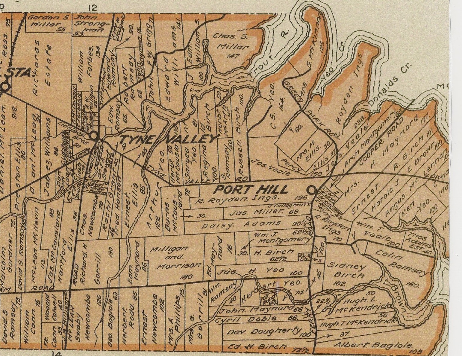 As one of the oldest residents of Lot 13, Reg was often interviewed and quoted in local histories of the area. After marrying Mary Adams in 1924, he lived on her farm in Tyne Valley. According to Reg, he "hauled many the load of mussel mud from the river bed between Low Point and Bird Island, and spread it by hand on the fields to improve them." On a 1928 map of Lot 13, Reginald Birch is shown on 100 acres on the bank of Trout River, in roughly the same spot occupied by the Humphrey Dyment Sr. farm in 1878.