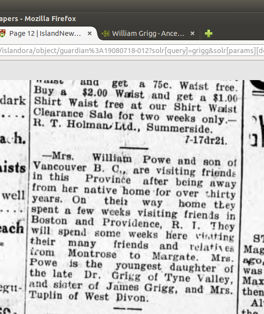 Gregg William Summerside Journal 6 January 1881, page 3, col. 2 We are sorry to record the sudden death on Thursday last, by apoplexy, of one of the oldest and most highly respected members of society in Prince County, Dr. William Gregg [Grigg], of Tyne Valley.