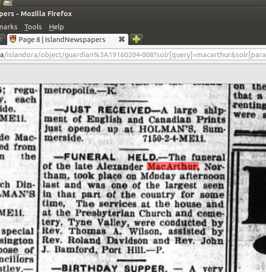 The Charlottetown Guardian noted that his funeral was "one of the largest seen in that part of the country for some time."