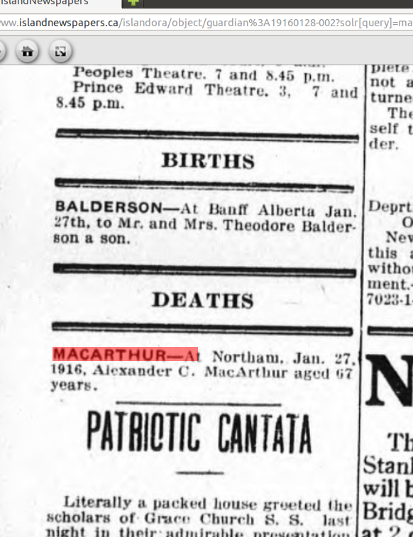 | Death | January 27, 1916 | Northam, Lot 13, Prince County, Prince Edward Island, Canada | from gravestone; died of Bright's Disease | |