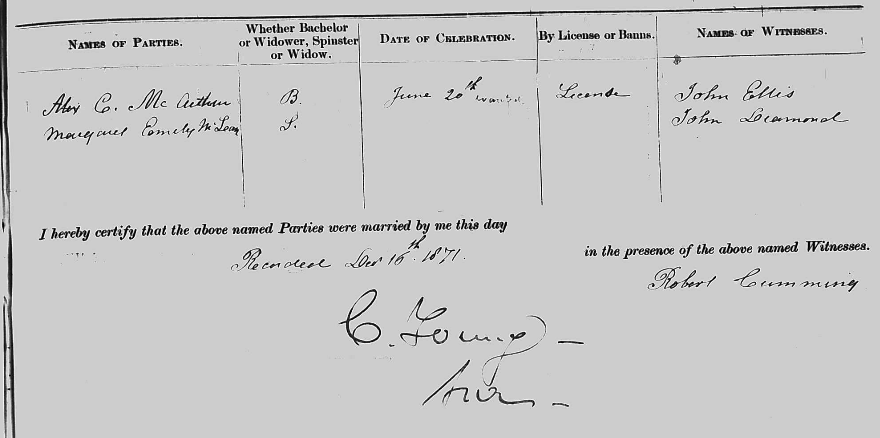 | Marriage | June 27, 1871 | married by Robert Cummings; wit. were John Ellis and John Diamond | ||