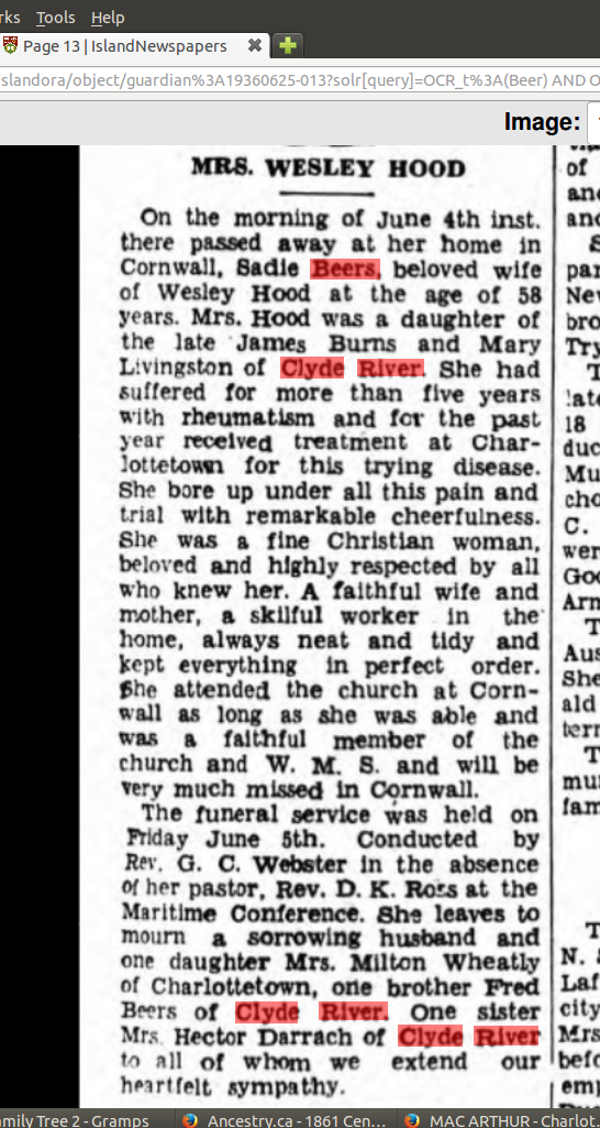 | Death | June 4, 1936 | Cornwall, Lot 32, Queens County, Prince Edward Island, Canada | Mrs. Wesley Hood at age 58 in Cornwall United church records | |