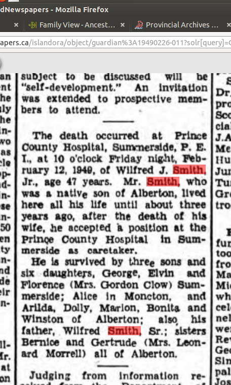 The death occured at Prince County Hospital Summerside PEI at 10 O'clock Friday night February 12 1949 of Wilfred J. Smith, Jr age 47. He was a native son of Alberton, lived here all his life until about 3 years ago, after the death of his wife, he accepted a position at the Prince County Hospital in Summerside as caretaker.