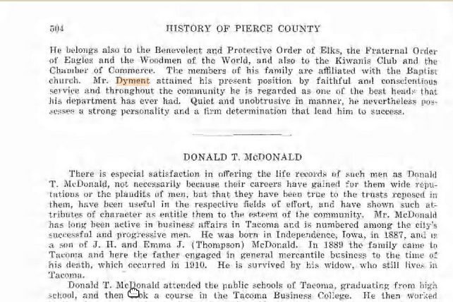 "DYMENT, Henry Dyer, City Councilman, Commr. Public Safety, City Hall, Tacoma; b. Prince Edward Island, Can., Oct. 3, 1965; s. Henry and Matilda (Hardy) Dyment; m. Emma Jane Ellis, of Prince Edward Island, Sept 23, 1890; six children, Stella M. (Whitney), Harry D., Ray E., Thad W., Lloyd W. and Lois E. (Cummings); came to Wash. 1898 and entered police dept. of Tacoma in 1907, passing through all grades to chief; chief of police 1921-1925; Commr. of Public Safety (elected) 1925-1927. Lodges: Masonic Shrine, Moose, Elks, Eagles, W.O.W. Clubs: Kiwanis, Young Men's Republican, Chamber of Commerce; Republican; Protestant; rec., hunting and fishing; res. 5601 S. Sheridan Ave. "(As quoted in "Who's Who in Washington State," Vol. 1, 1927)