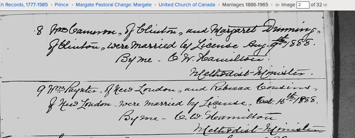 William Paynter, from New London, and Rebecca Brown Cousins, a widow, were married by Rev. C. W. Hamilson a Methodist minister in Margate in 1888.