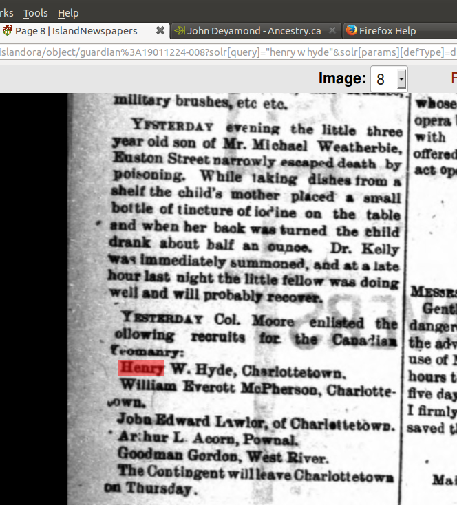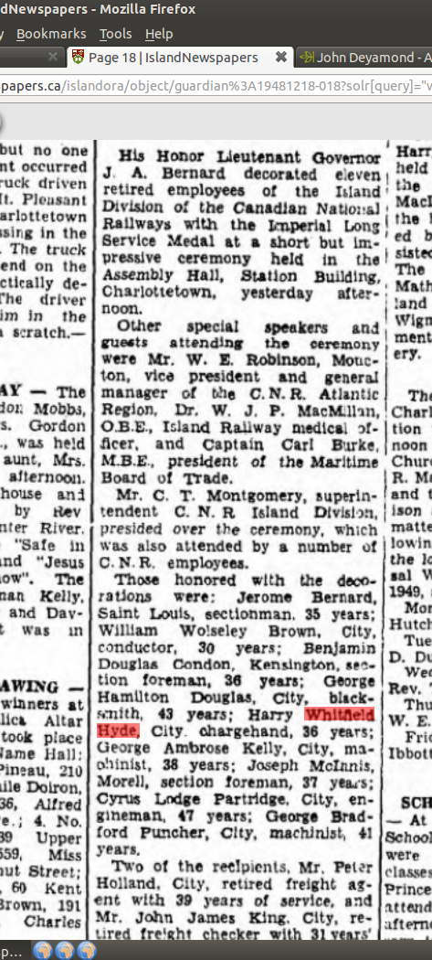 | Birth | March 17, 1881 | Prince Edward Island, Canada | also known as Harry Whitfield Hyde; PEI Baptismal Index, baptized same day as John Wesley & Alvah | 1b 2b 3b |