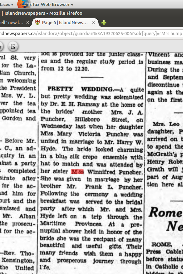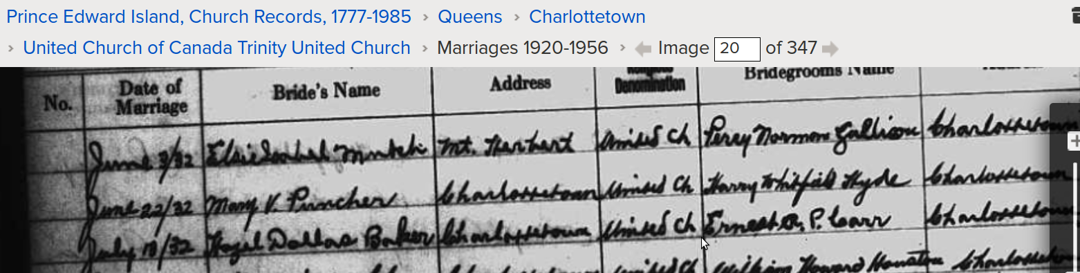 | Marriage | 1932 | Prince Edward Island, Canada | ||