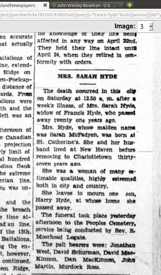 Harry Whitefield Bowman is in the PEI Baptismal Index as the son of Jane McFadyen and John Bowman. When Jane died, her children were scattered among family and neighbours. Harry Whitfield was with the Hyde family as an adopted son.