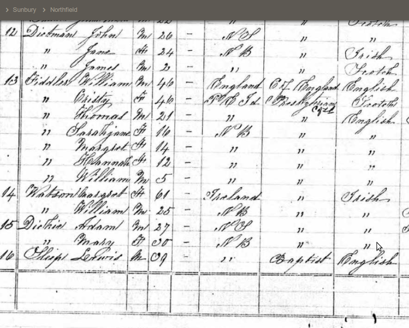 His father John, born England, and sister Mary, born on the Island, were living with his family in Sunbury, NB in the 1861 census, which further ties him to the family of John Fiddler and Hannah Offer from England. William and Christiana's daughter Margaret, age 4, was their first child born in new Brunswick.