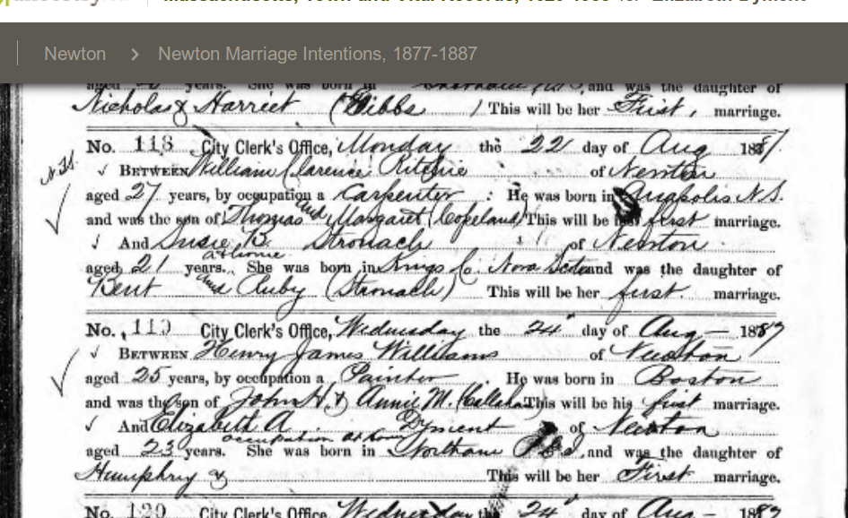 Elizabeth Ann was born 5 November 1863, and baptized as the daughter of Humphrey Dyment, Jr. and Nancy McDougall. (her gravestone said born 5 Dec 1863) She was living in Northam in 1881, with her parents, age 17. Elizabeth probably met Henry James Williams in Massachusetts, where they registered their intention to marry, so presumably she had gone to the States to find work. She and Henry, the son of John H. Williams and Annie M. Callahan, were married on 7 September 1887 in Tyne Valley. They returned to Massachusetts.