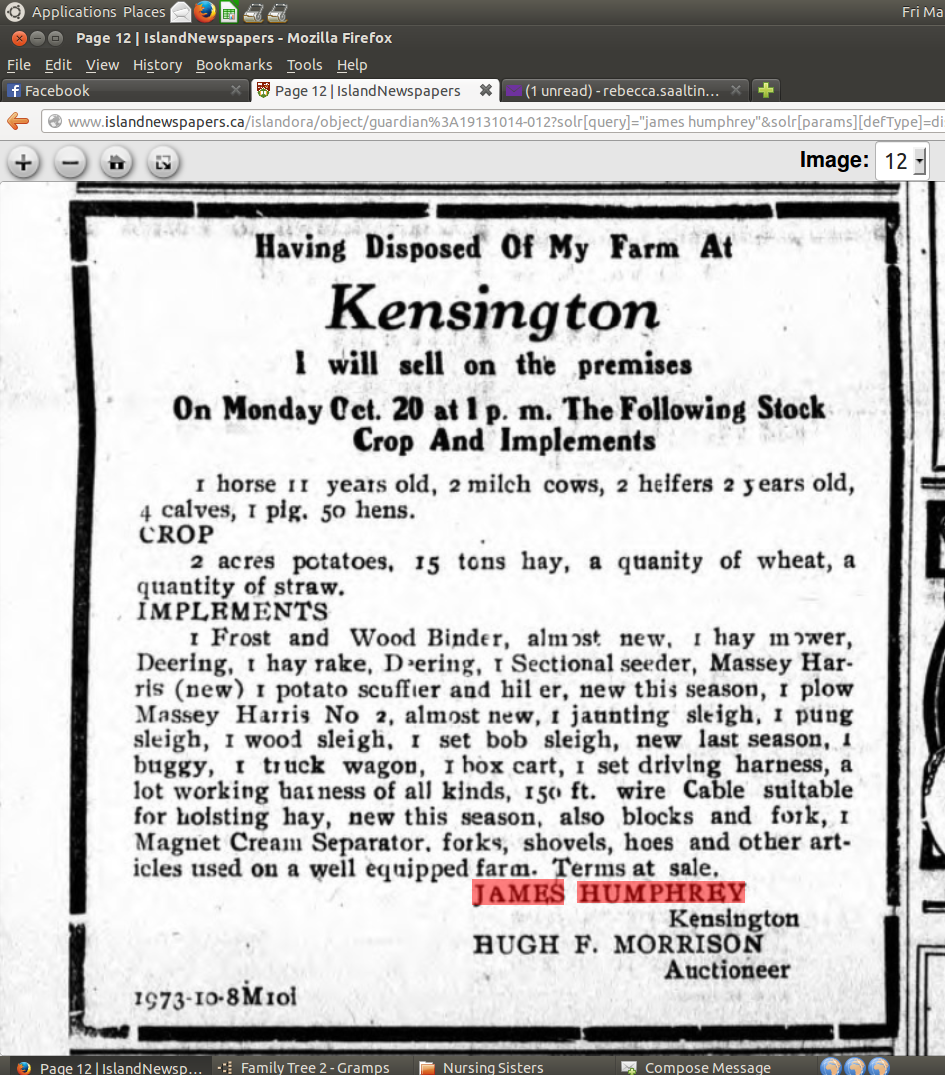 James and his second wife Margaret were in the 1881 census with James' mother Jannet B. Humphrey, who was 80. Son Charles Bowman was living in Moncton. There was a William Humphrey who had a son George Daniel in 1878 who was baptized in Margate, and a daughter who died young in Kensington, but I have not been able to make the connection to this family.