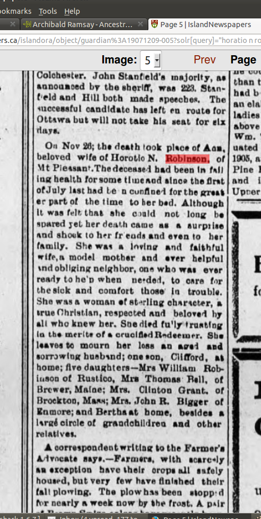 | Death | November 26, 1907 | Prince Edward Island, Canada | obituary in the guardian | |