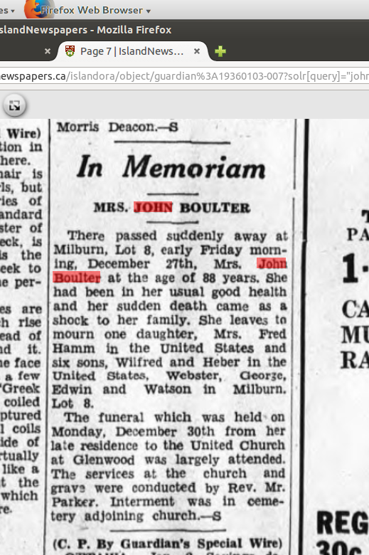 Charlottetown Guardian Friday January 3, 1936 MRS JOHN BOULTER. There passed suddenly away at Miiburn, Lot 8, early Friday morning, December 21th, Mrs. John Boulter at the age of 88 years. She had been in her usual good health and her sudden death came as a shock to her family. She leaves tn mourn one daughter, Mrs. Fred Hamm in the United States and 6 sons, Wilfred and Heber in the US, Webster, George, Edwin and Watson in Milburn, Lot 8.