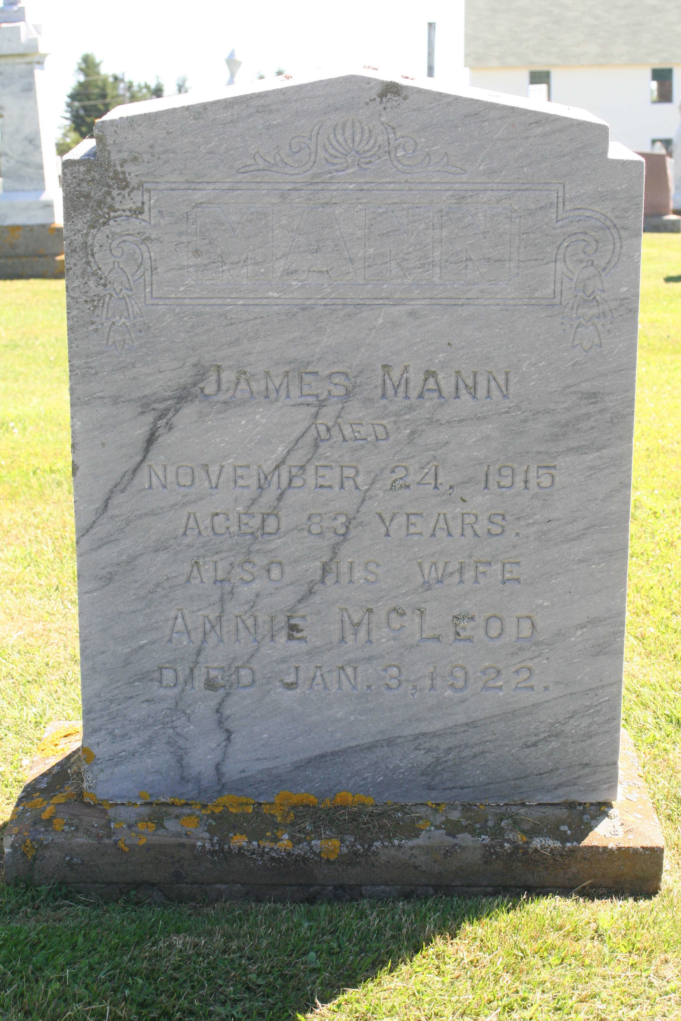 James Mann, from Lot 20, married Ann McLeod, daughter of Murdock MacLeod and Ann Hardy of Park Corner, on March 24 1870. On Thursday the 24th inst., by the Rev. A. Cameron, Mr. James Mann, Lot 20, to Miss Ann McLeod, of Park corner. (The Islander April 1 1870).