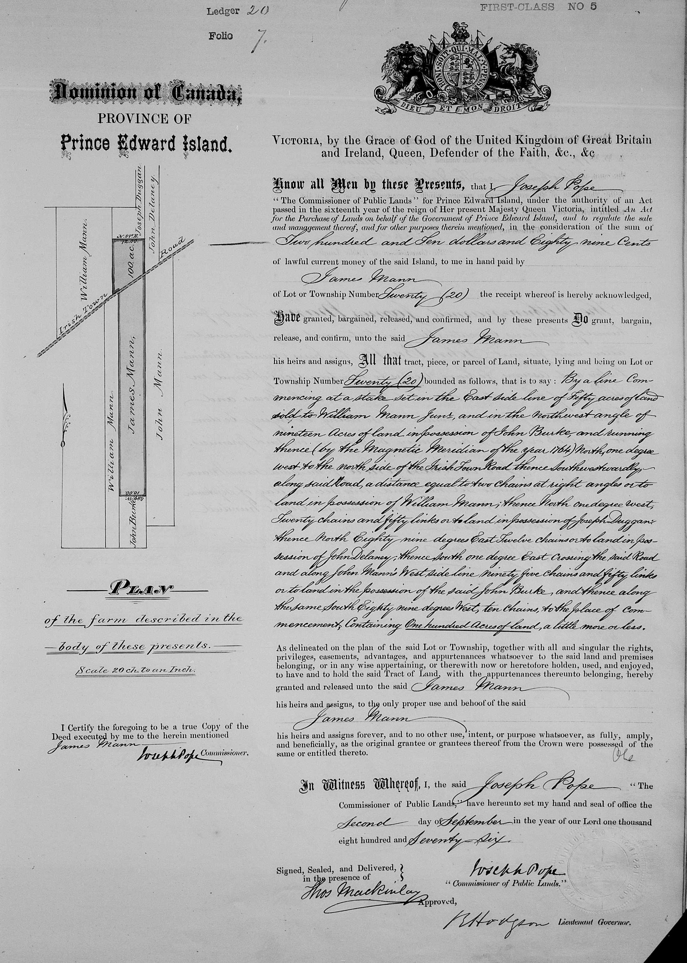 James Mann was listed in the index of the Land Commissioner's report dated 1870, with 100 acres in Lot 20. According to the 1891 census, James and Ann were living in a 2 story wood-frame house with 9 rooms. James indicated that his parents had been born in Scotland and England.