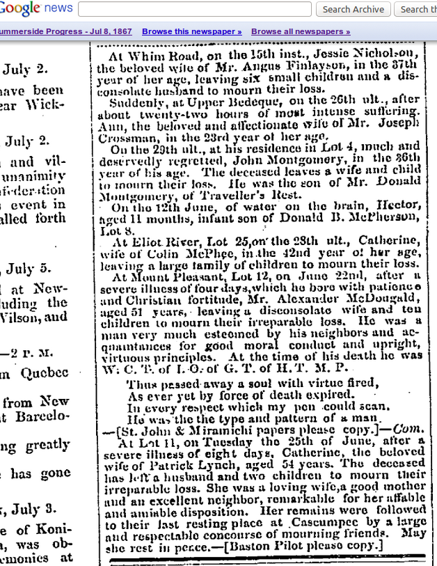 d. Mount Pleasant, Lot 12, P.E.I., Saturday, 22nd June, Alexander McDOUGALD, age 51. Daniel F. Johnson : Volume 25 Number 757, Date July 9 1867, Place Saint John, Newspaper Morning Telegraph