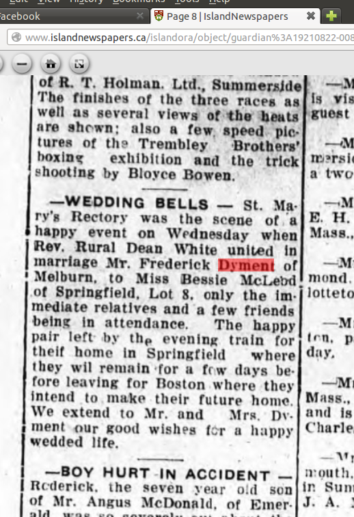 Fred was the son of George Dyment and Ellen Jane Silliker. He married Bessie McLeod from PEI.
