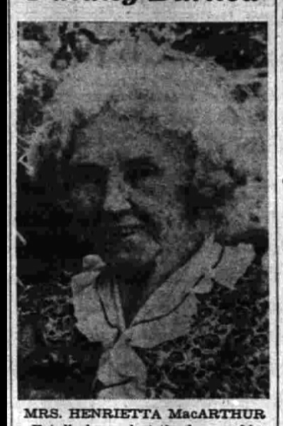 MRS. HENRIETTA MacARTHTUR Fatally burned at the home of her daughter and son-in-law, Mr. and Mrs. James S Creighton, 1900 Southwest Capital avenue, yesterday when an electric heater ignited her clothing. Third degree burns over her entire body, suffered when her dress was ignited by a small electric heater, caused the death at 6 p. m. Wednesday of Mrs. Henrietta G: MacArthur 85, the mother of Mrs. Blanche Creighton of 1900 Southwest Capital avenue. -" Mrs. MacArthur's death in Community hospital followed by seven hours the accident in the Creighton home. She was alone in the house in an upstairs bedroom when the flames enveloped her body. Apparently she had stepped too close to the electric heater, which she had attached a few moments before while making her bed. Mrs. MacArthur, whose burns were particularly severe from her thighs to the top of her head was In a semi-conscious condition, lying in an archway between the dining room and. the living room of the house, her clothes burned from her body, when Mrs. Creighton and her husband, James S. Creighton, returned from a shopping trip downtown. The living room rug was afire where she lay. Extinguishing the flames. Mr. Creighton immediately called an ambulance. The fire was extinguished by the Battle Creek township fire department, and they took Mrs. MacArthur to the hospital.