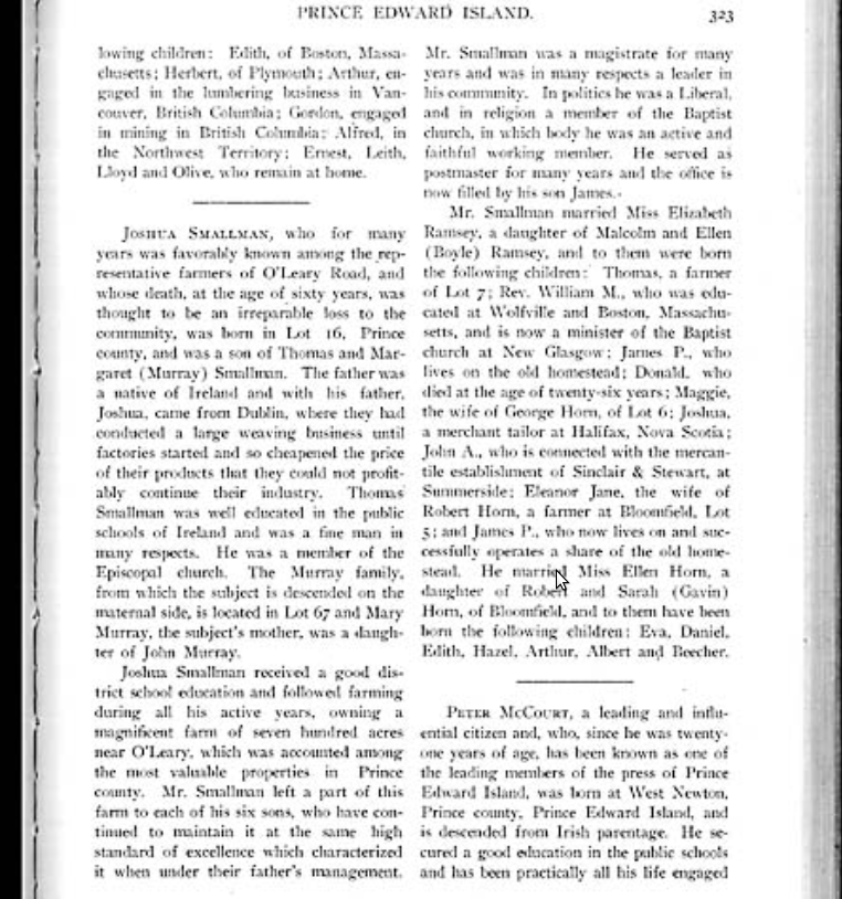 Mr. Smallman married Miss Elizabeth Ramsey, a daughter of Malcolm and Ellen (Boyle) Ramsey, and to them were born the following children: Thomas, a farmer of Lot 7; Rev. William M., who was edu-cated at Wolfville and Boston, Massachu-setts, and is now a minister of the Baptist church at New Glasgow; James P., who lives on the old homestead; Donald, who died at the age of twenty-six years; Maggie, the wife of George Horn, of Lot 6; Joshua, a merchant tailor at Halifax, Nova Scotia; John A., who is connected with the mercan-tile establishment of Sinclair & Stewart, at Summerside; Eleanor Jane, the wife of Robert Horn, a farmer at Bloomfield, Lot 5; and James P., who now lives on and suc-cessfully operates a share of the old home-stead. He married Miss Ellen Horn, a daughter of Robert and Sarah (Gavin) Horn, of Bloomfield, and to them have been, born the following, children: Eva, Daniel,