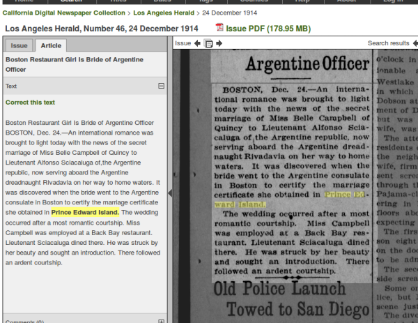 "An international romance was brought to light today with the news of the secret marriage of Miss Belle Campbell of Quincy to Lieutenant Alfonso Sciacaluga of the Argentinean republic, now serving aboard the Argentine dreadnaught Rivadavia on her way to home waters. It was discovered when the bride went to the Argentine consulate in Boston to certificate the marriage certificate she obtained in Prince Edward Island. The wedding occurred after a most romantic courtship. Miss Campbell was employed at a Back Bay restaurant. Lieutenant Sciacaluga dined there. He was struck by her beauty and sought an introduction. There followed an ardent courtship." (newspaper clipping, 1914)