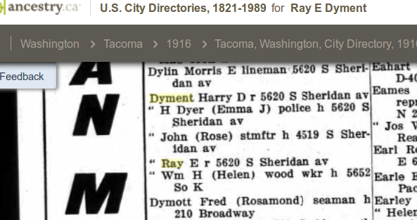William Dyment, b. 1891, was back in Washington State in 1930, a widower with three children. In 1940, William was living with his son Fred, age 23.