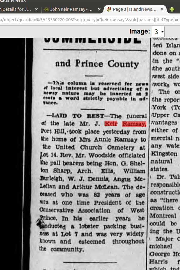 | Death | 1933 | Prince County Hospital, Summerside, Prince County, Prince Edward Island, Canada | ||