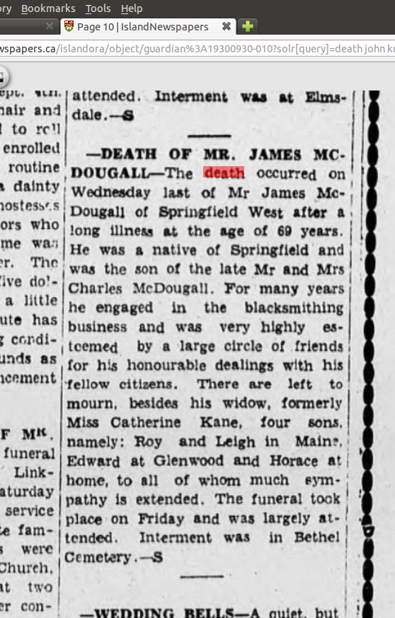 | Death | September 24, 1930 | Greenhill, Lot 8, Prince County, Prince Edward Island, Canada | at age 69 | |
