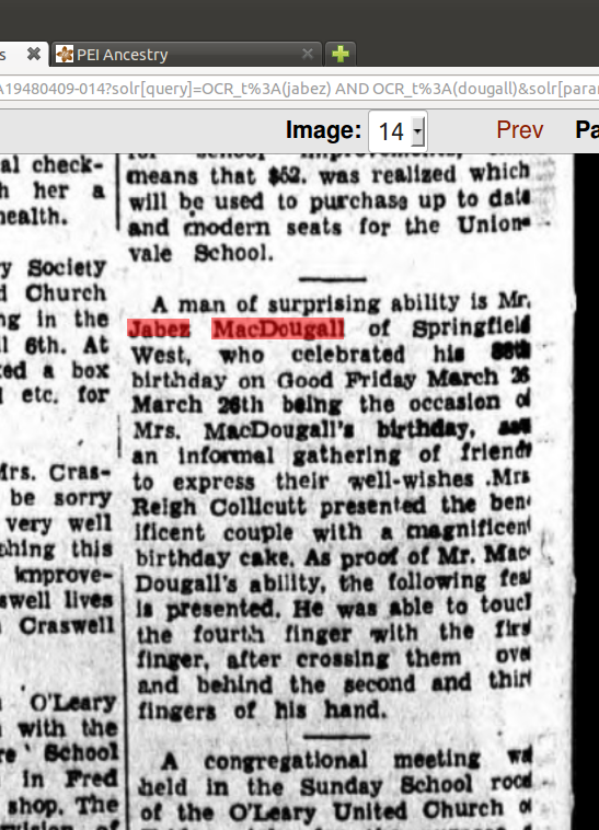 Jabez MacDougall celebrated his 94th birthday on March 25 1954, in good health. Present were daughters Mrs. Reginald Shaw and Mrs. Charles MacWilliams of West Cape and Mrs. Kenneth Towle of Walpole Mass. Son Elmer lives in Vancouver BC.