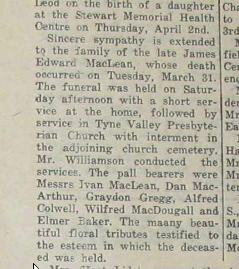 According to his obituary, he was the last surviving member of the family of Donald and Sarah McLean. His wife predeceased him about 14 years ago. He leaves to mourn one son Laughlin on the homestead. Two daughters, Ethel, Mrs. (Rev) Andrew Brown and Miss Emily McLean, also of Northam.