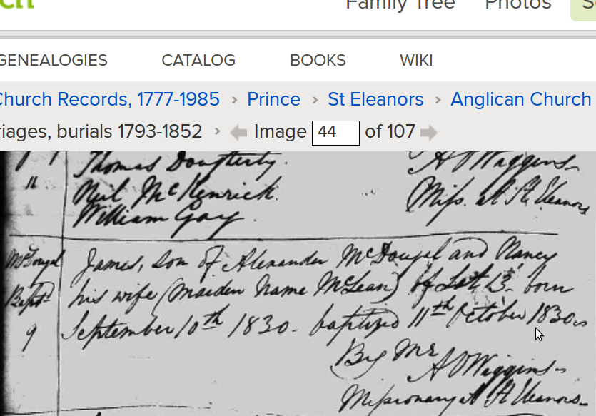 | Death | before 1868 | Prince Edward Island, Canada | there is a gravestone for a James McDougall, died 1867, in a Prince Co. cemetery. Sarah remarried in 1868. | |
