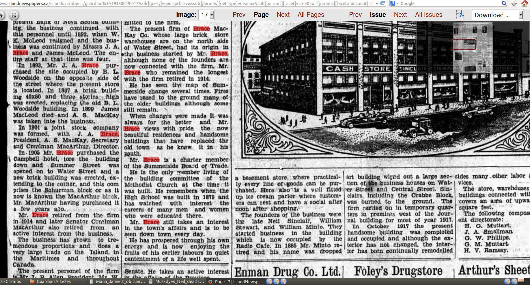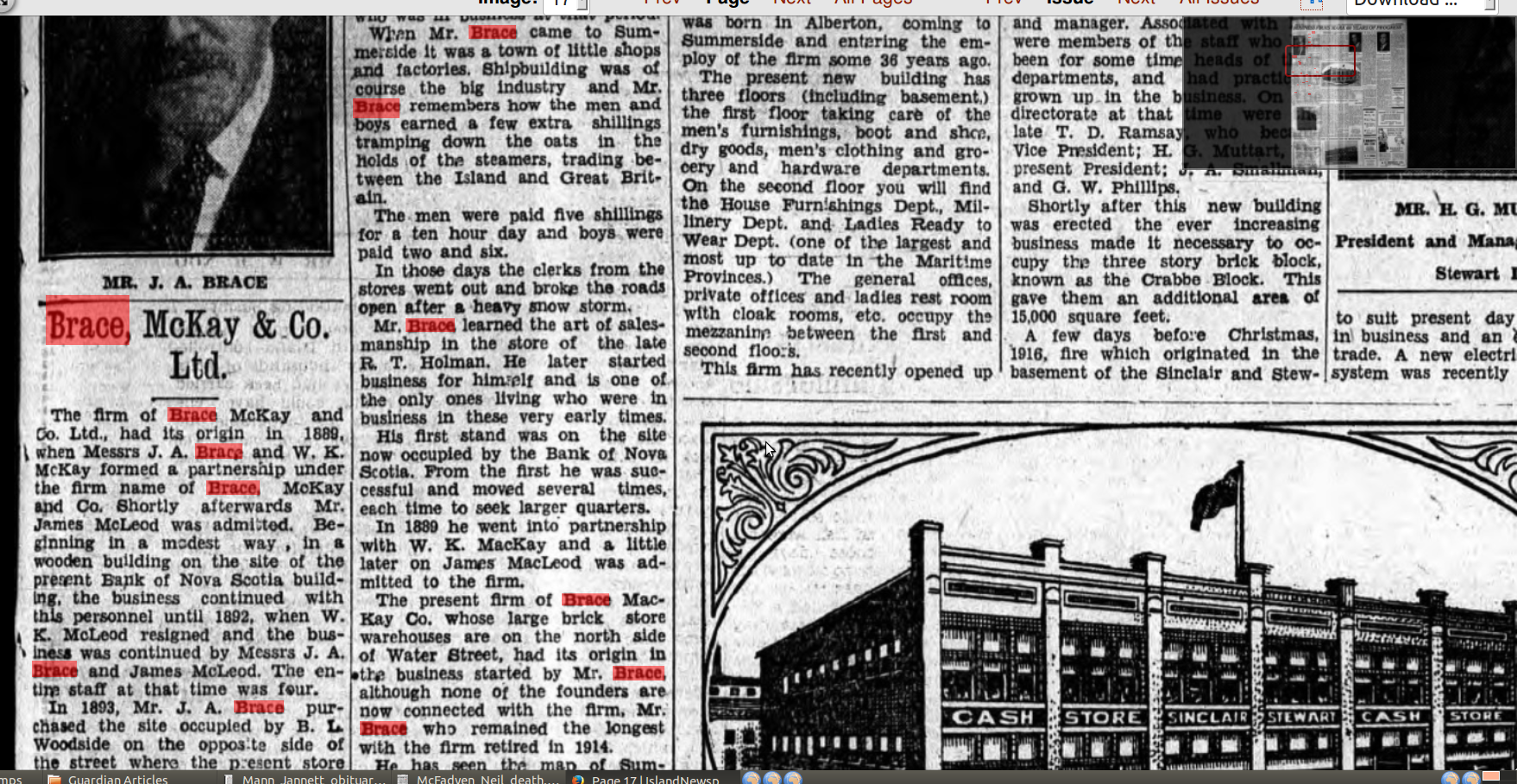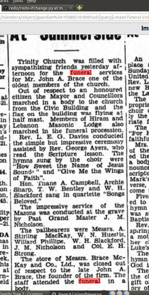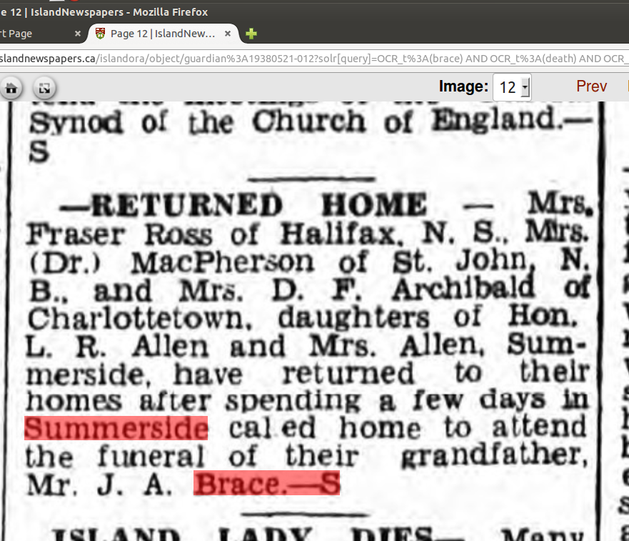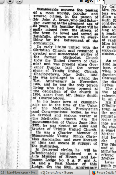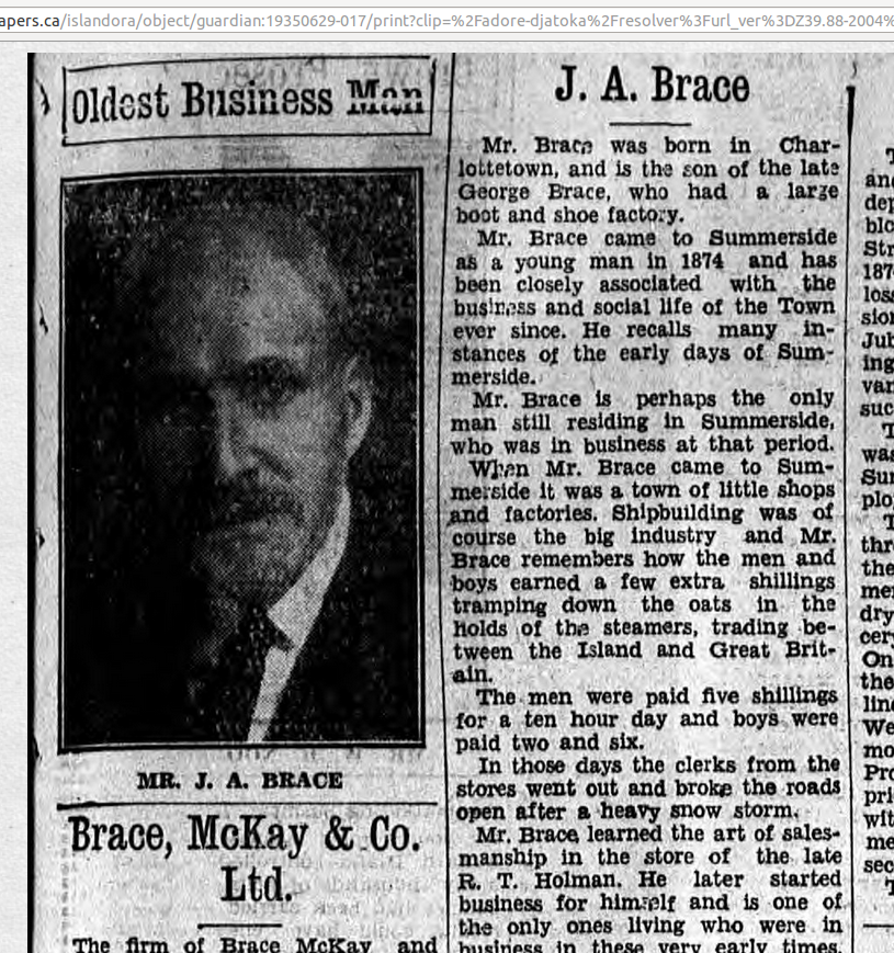 "There is one other who I think is one of the old time bunch. If not, he is a close second. It is our old friend John A. Brace, one of the founders of the firm Brace, McKay & Co...Albert is, I think, the only one whats left of the original firm bearing his name. But he never found time to retire that I have heard of yet. He aint that kind uv a feller, no sir! as Hiram Hornbeam said. He has always been a hustler, made a financial success in life and has not been the sole beneficiary either. Many have tasted the fruits of his labor. He has always been foremost in every movement tending to the good of his fellow man and improvement of his home town, Summerside. Long life to him." (from PEI Ancestry)