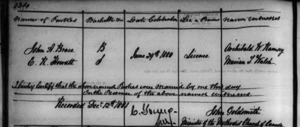 John Albert Brace was born on December 28 1855 in Charlottetown, the son of George Brace and Hannah Mann. He died in Summerside at the age of 82 years in 1938.