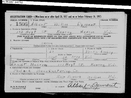 In 1941, Albert Wilson Dyment registered for the draft in World War 2 at the age of 62. (the Old Man Draft Cards) He gave his nephew Ernest Meshrow as his contact point. His place of birth was Perth Amboy, New Jersey on September 30 1881. He was a pressman.