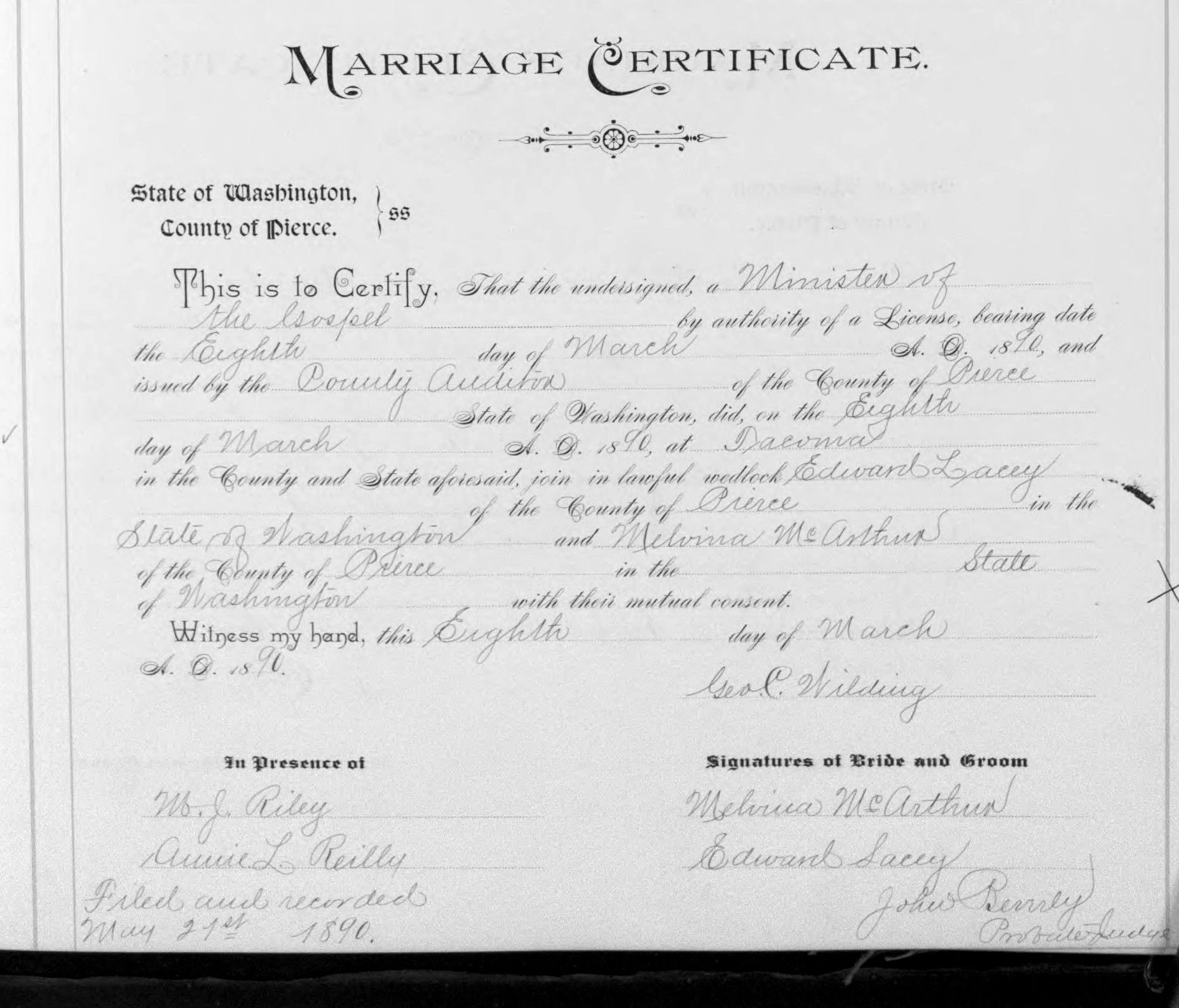 Melvina, her husband Edward Lacey and daughter can be found in the 1892 Washington census, but by 1900 they were back in Massachusetts, where Edward had found work in a cemetery. Their two daughters, aged 8 and 6, had been born in Washington, but their son Frederick, age 2, was born in Massachusetts.