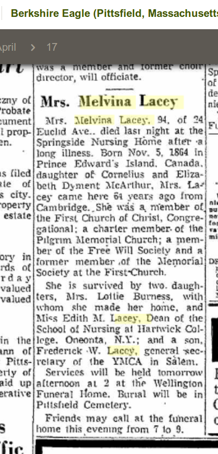 Birth date: abt 1865 Birth place: Prince Edward Island Residence date: 1 Apr 1940 Residence place: Pittsfield, Berkshire, Massachusetts, United States