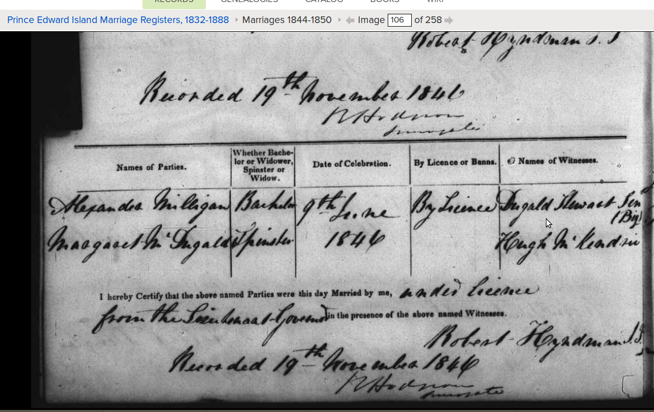 Margret McDougall married Alexander Milligan on June 9 1846. Margaret died before 1877, when Alexander, a widower, married Catherine Millar Dollar. Alexander, age 66 and born in Scotland, was living with Catherine, age 60, in the 1881 census in Lot 9. Other Milligans in the household - probably the children of Margaret and Alexander, were Alexander (26), William (17), Isabelle Ellen,