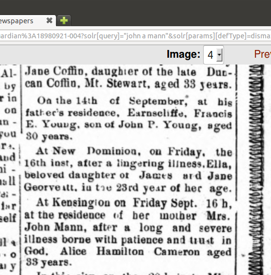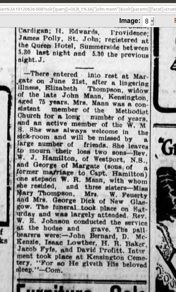 | Death | June 22, 1912 | Prince Edward Island, Canada | Mrs. John Mann @75 in Kensington Margate church records | |
