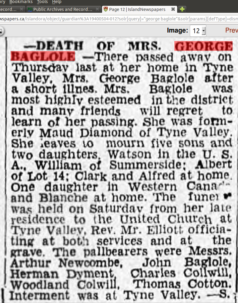 Summerside Journal, 1940, obituary accessed on PEI Ancestry: "There passed away last night...Mrs. George Baglole, who was formerly Maude Diamond of Tyne Valley... She leaves ...seven children. They comprise: one daughter in Western Canada[Alice]; Blanche at home; William in Summerside; Albert of Lot 14; Clark and Alfred at home, and Watson in the United States."