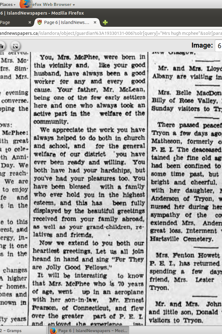 | Death | September 2, 1936 | Coleman, Lot 9, Prince County, Prince Edward Island, Canada | obit from Guardian 1936 Sept 23 page 4 | |