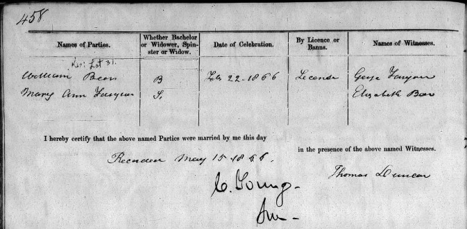 William Beer, eldest son of Thomas Beer and Jane Robertson, married Mary Ann Feavyour on 22 February 1866. Mary Ann's maiden name is usually spelled Favor.