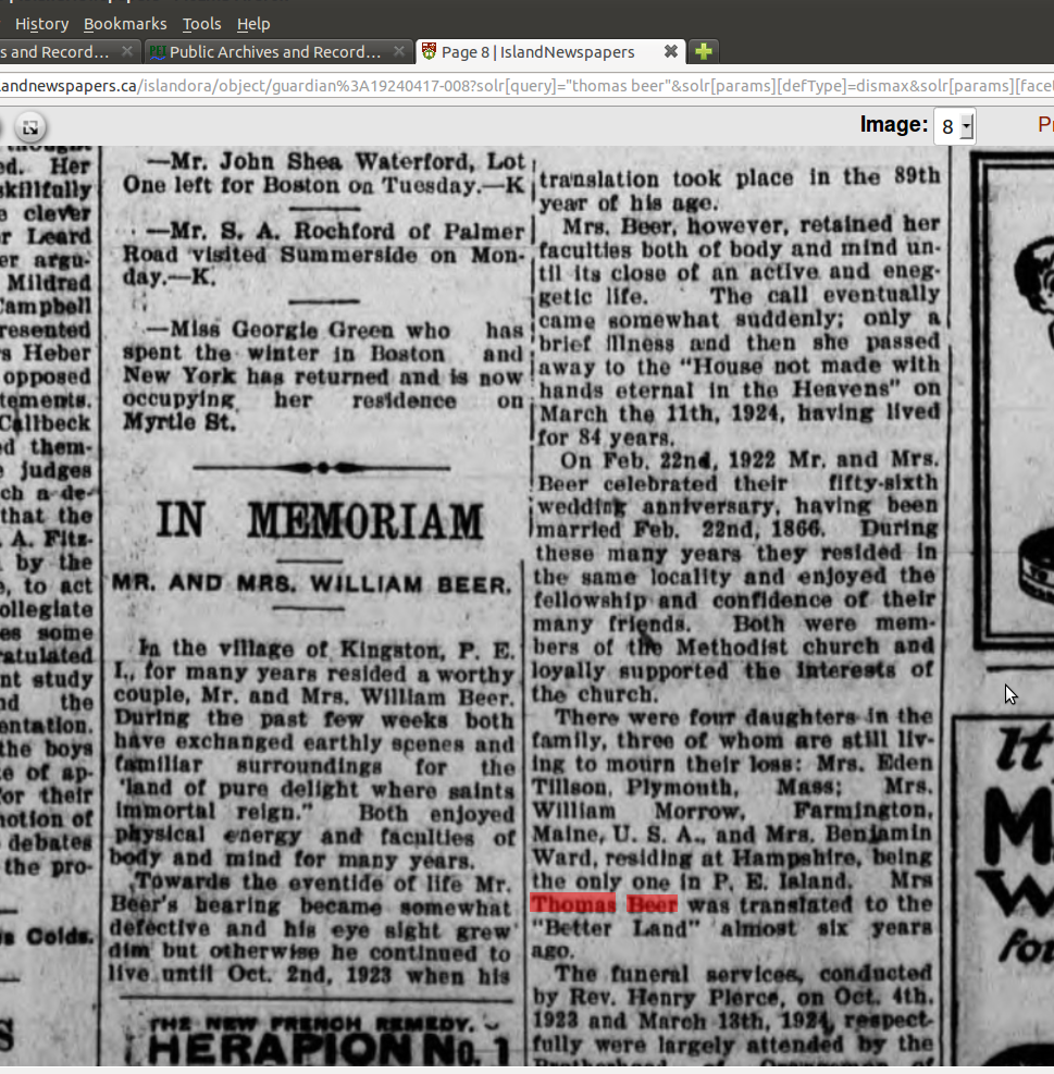There were four daughters in the family, three of whom are still living to mourn their loss: Mrs. Eden Tillson, Plymouth, Mass; Mrs. William Morrow, Farmington, Maine; and Mrs. Benjamin Ward, residing at Hampshire, being the only one on PEI. Mrs. Thomas Beer was translated to the “Better Land” almost six years ago.