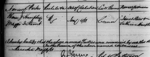 Thomas Humphrey and Maggie J. Stavert were married on January 4 1881 by license by the Rev. Robert Patterson. Witnesses were James Stavert and Catherine Humphrey.