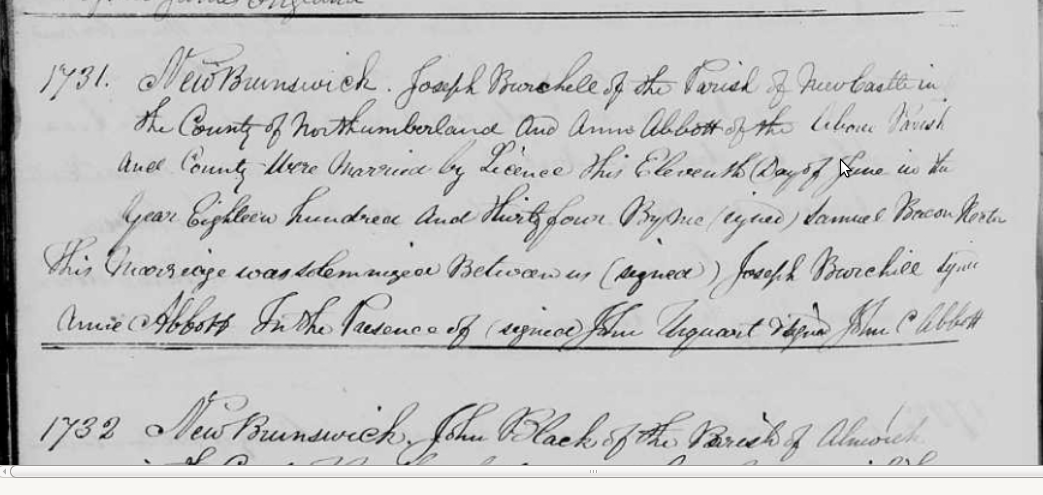 Anna Abbott and Joseph Burchill, both of the Parish of Newcastle, were married in Northumberland County New Brunswick in St. Paul's Anglican Church on 11 June 1834. There were four children for Joseph Burchill, ship's carpenter and Ann in St. Paul's records: Jane, born August 24 1835; John, in 1838; George on 26 December 1840, and Joseph 28 August 1843. The next children were Catherine Ann, born September 1845 in Buffalo, New York; Andrew in 1847; Robert in 1848; Lucretia in 1851 and Sarah Jane in 1853. Most of the surviving children in this family gave their place of birth as Buffalo, New York, which is understandable since they must have lived there from an early age.