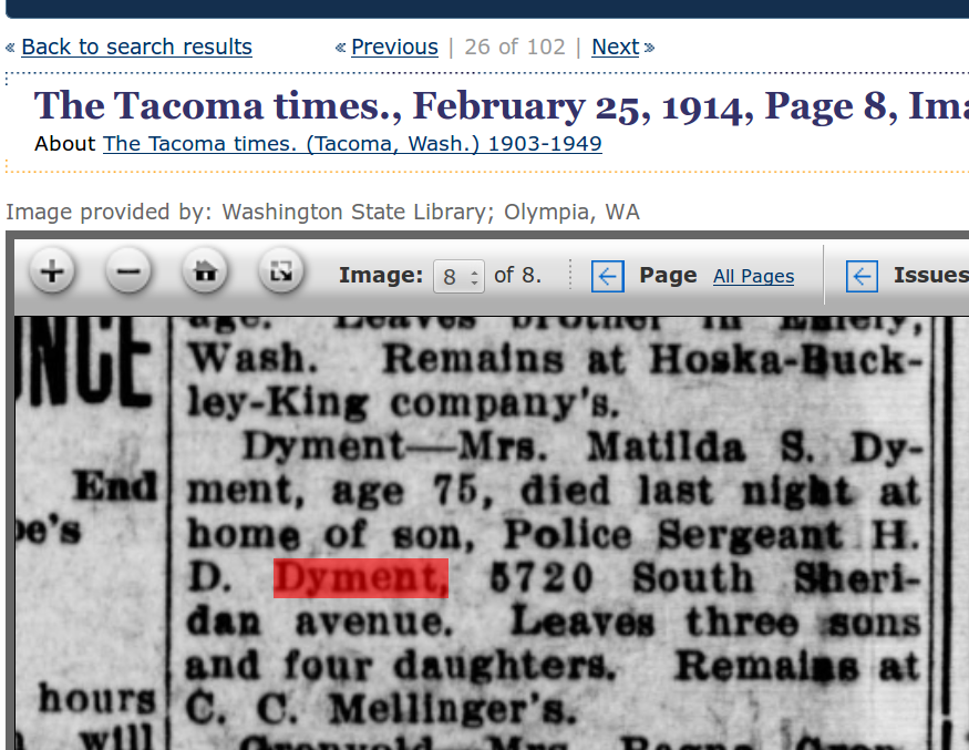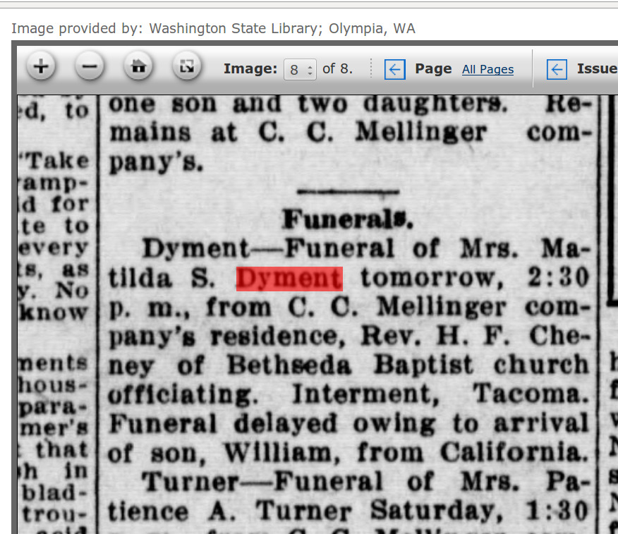 Her obituary in the Tacoma Times noted that she died on February 24 1914 at the age of 76. She had been living with her son, Police Sargeant H. D. Dyment, and was survived by 3 sons and 4 daughters. The funeral was delayed for a day to allow her son William to arrive from California.