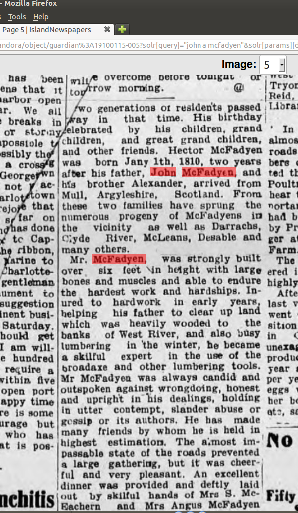 Summerside Journal: At Bannockburn 31 January 1886 Angus McFadyen in his 87th year. Emigrated from Scotland in 1808. He was an elder under the ministry of the late Rev. Donald MacDonald (PEI Master Name Index).